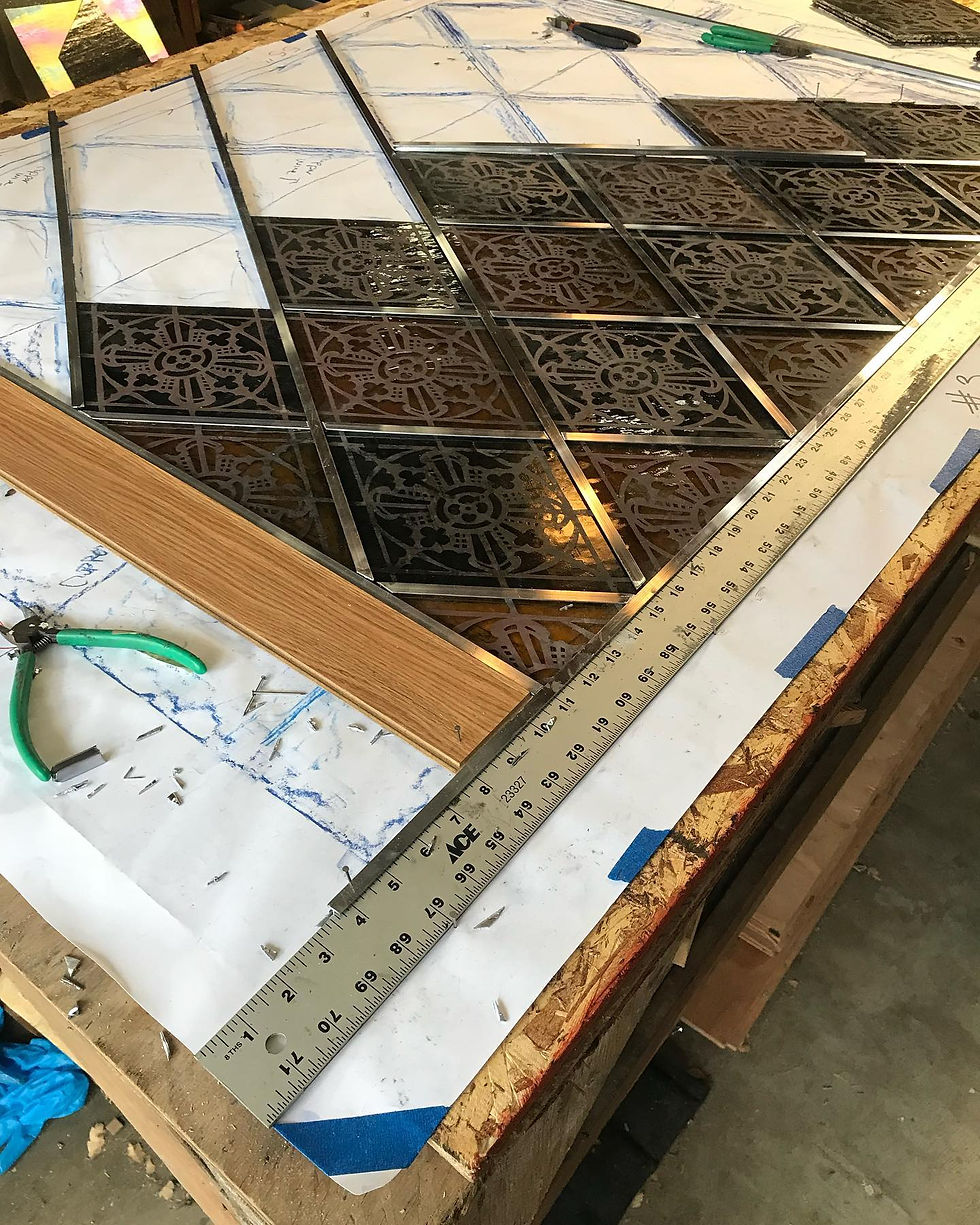 We built custom tables to hold our clients wagon wheels which held the newly built stained glass win